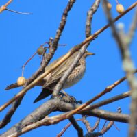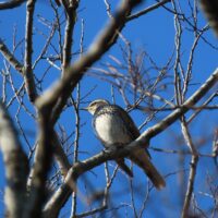 枝にかぶっており、肝心の顔が写っていませんが、胸の模様からハチジョウツグミだと思います。ツグミと比べると、胸の方が少し赤いです。江津湖ではあまり見かけない野鳥ですので、見かけた時はじっくり観察してみてください。