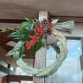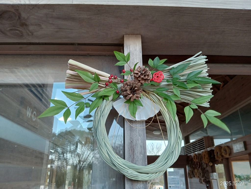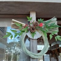ここ数年、管理棟に飾るお正月用のしめ飾りを手作りしています。 園内で拾った松ぼっくりや、花壇で育てたレモングラスで作ります。 「made in 江津湖」のしめ飾りです。