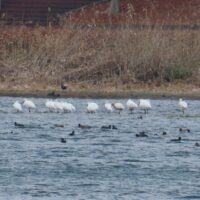 観察できた野鳥(五十音順):アオサギ、アオジ、オオバン、カイツブリ、カラムクドリ、カワウ、カワラバト、カワラヒワ、カンムリカイツブリ、キジバト、クロツラヘラサギ、コガモ、コサギ、シジュウカラ、スズメ、セグロカモメ、セグロセキレイ、ダイサギ、ツグミ、ツバメ、ニシオジロビタキ、ノスリ、ハクセキレイ、ハシブトガラス、ハシボソガラス、バン、ヒドリガモ、ヒヨドリ、ヘラサギ、ミサゴ、ムクドリ、モズ、ヨシガモ、計33種