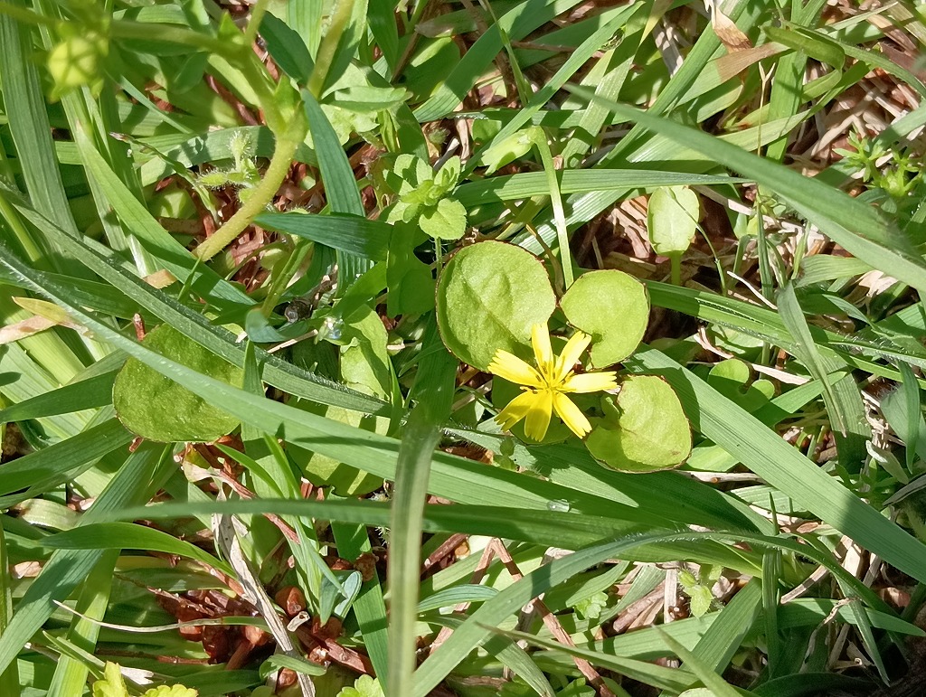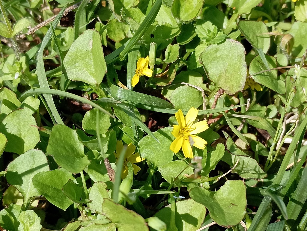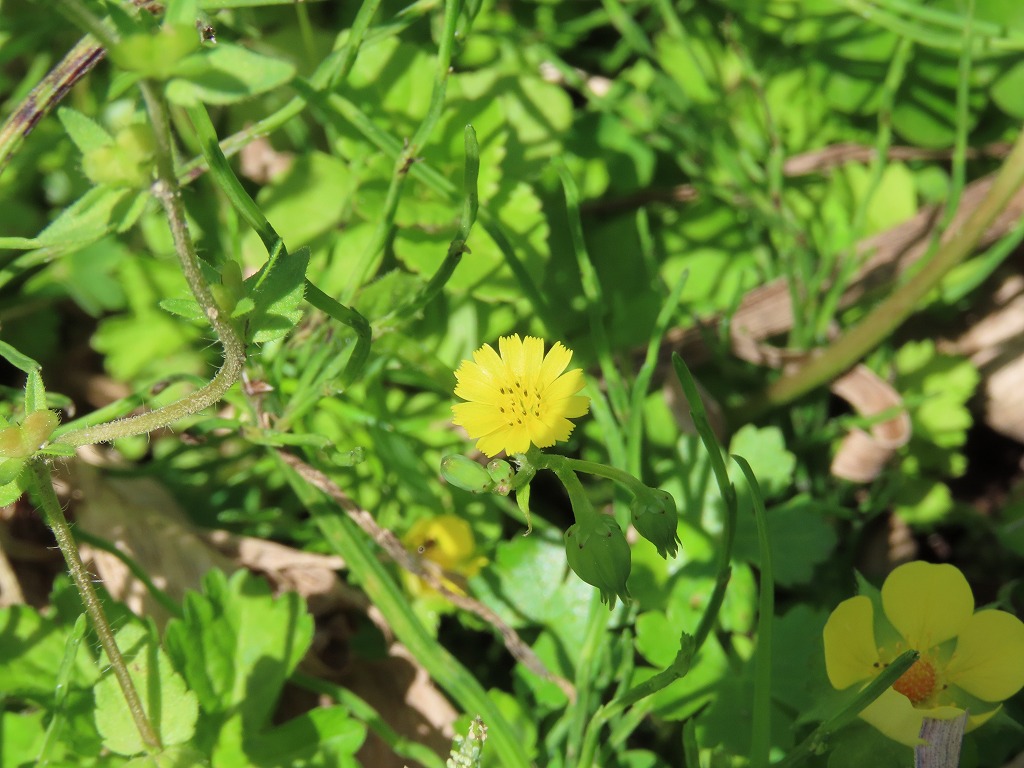 コオニタビラコです。春の七草のひとつです。オニタビラコとは違い、茎は立ち上がりません。その点はヤブタビラコと似ています。花を比べてみると、コオニタビラコの花びらの枚数は、ヤブタビラコの花びらの枚数より少ないです。その点でヤブタビラコとは区別できると思います。コオニタビラコは今少なくなっているようです。江津湖でもそれほど多くは観察できない植物です。
