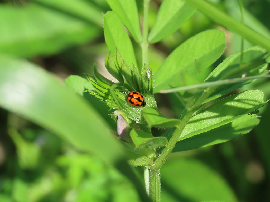 園内ではテントウムシの仲間たちを多く見かけるようになりました。一般的に見かけるナナホシテントウやとても小さいヒメカメノコテントウなど、いろいろな種類のテントウムシも出始めています。