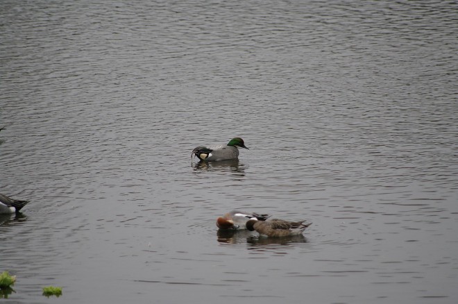 周囲のヒドリガモに比べて一回り大きく、顔当たりの毛色も違う様子。