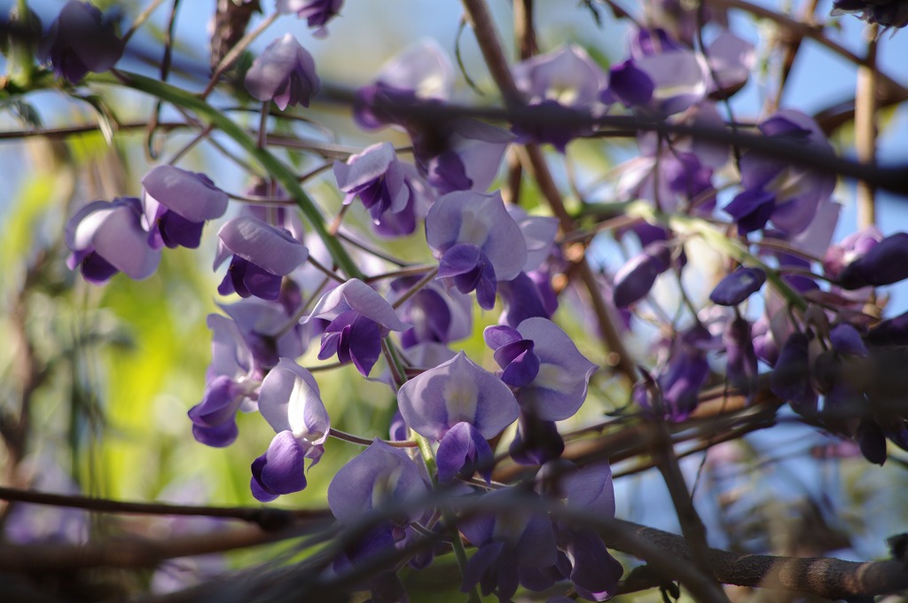 あちこちの藤棚で、紫の色彩と花の香りが魅力的なフジの開花が始まっています。4月の末頃には、よりしだれ、花房も増えていくことでしょう。