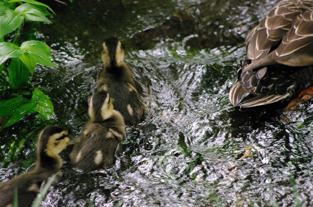 カルガモの親は雛を守るものの、エサを与えたりはしないということで、雛が食事にありつけそうな場所を求めて、あちこち移動して回っているようです。