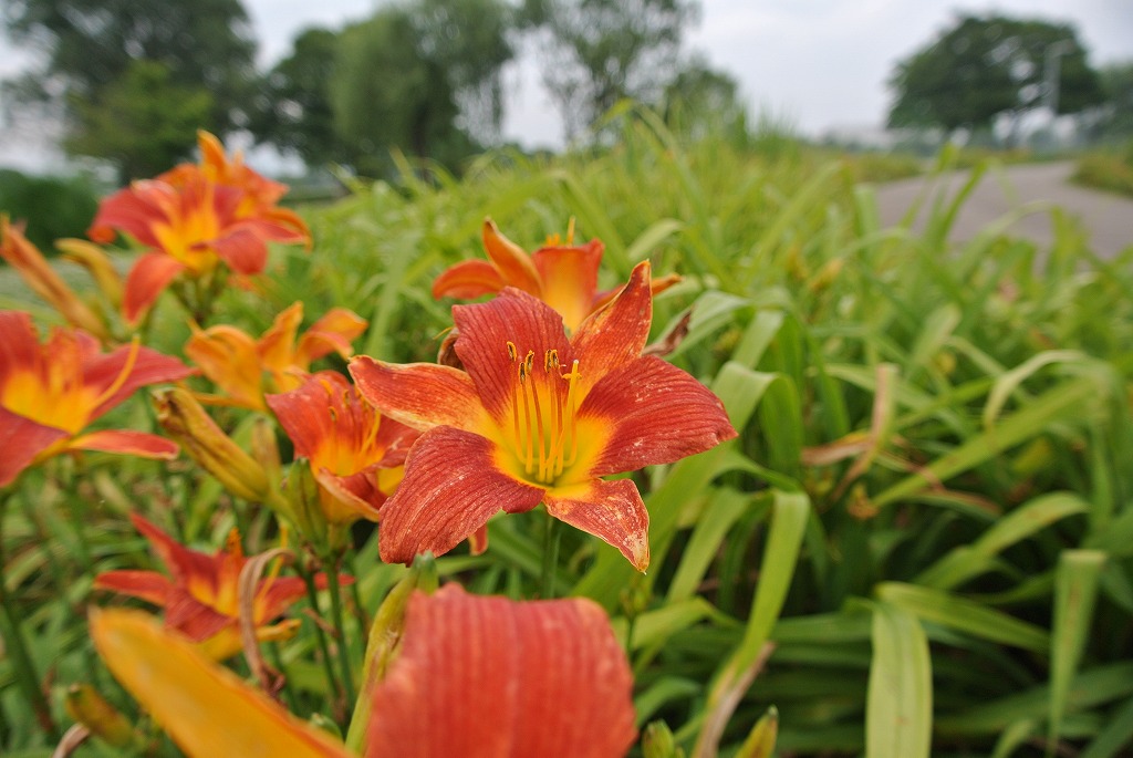 園路沿いに咲くヘメロカリスは、散策される人々の目を楽しませてくれますよ。