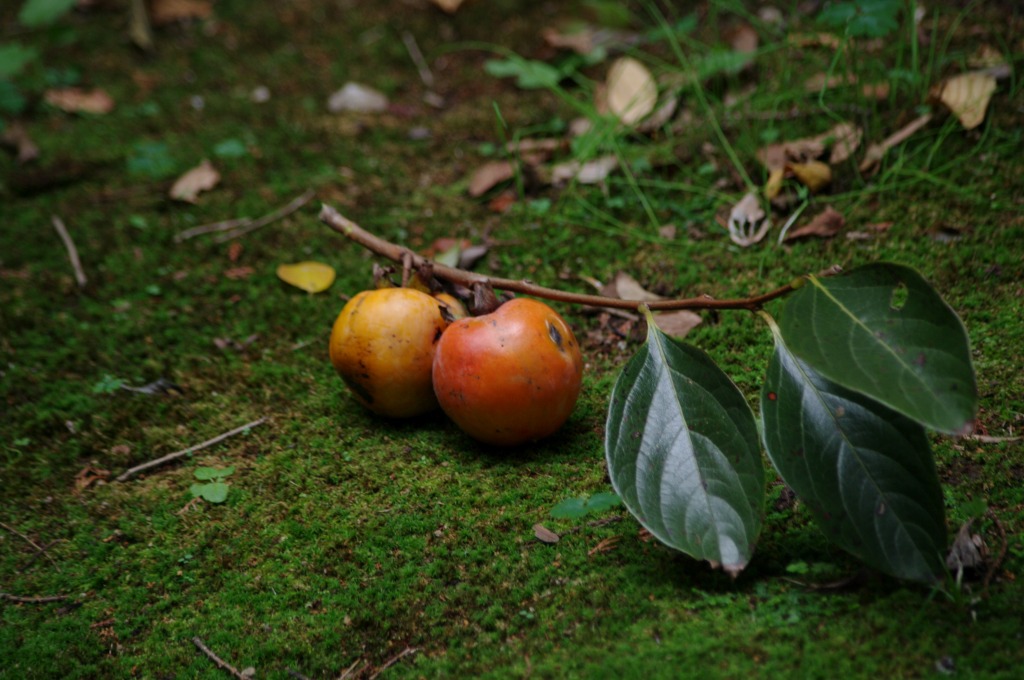 木の下には、紅葉した葉、鳥についばまれ落ちた種があります。そしてその柿の実がここに。