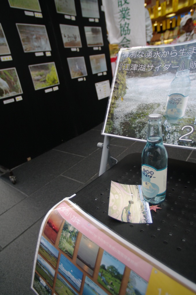 冬の江津湖は野鳥の楽園。どの鳥がどれくらいの頻度で見る事ができるか、を江津湖の特産品・江津湖サイダーと江津湖ハガキとともにご案内させていただきました。