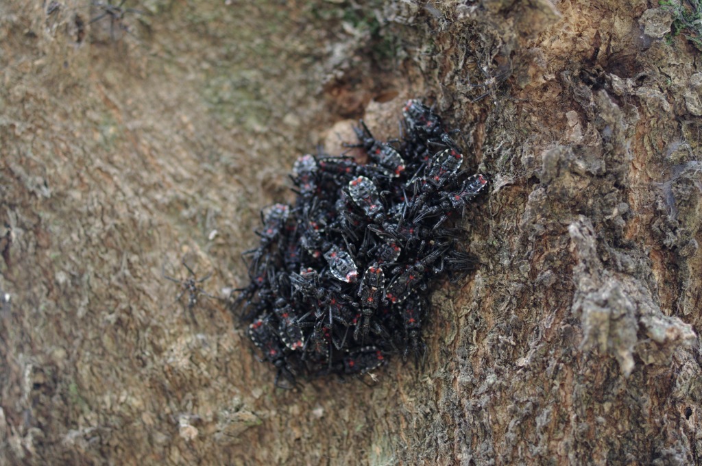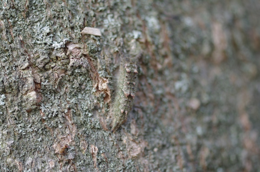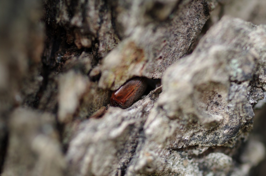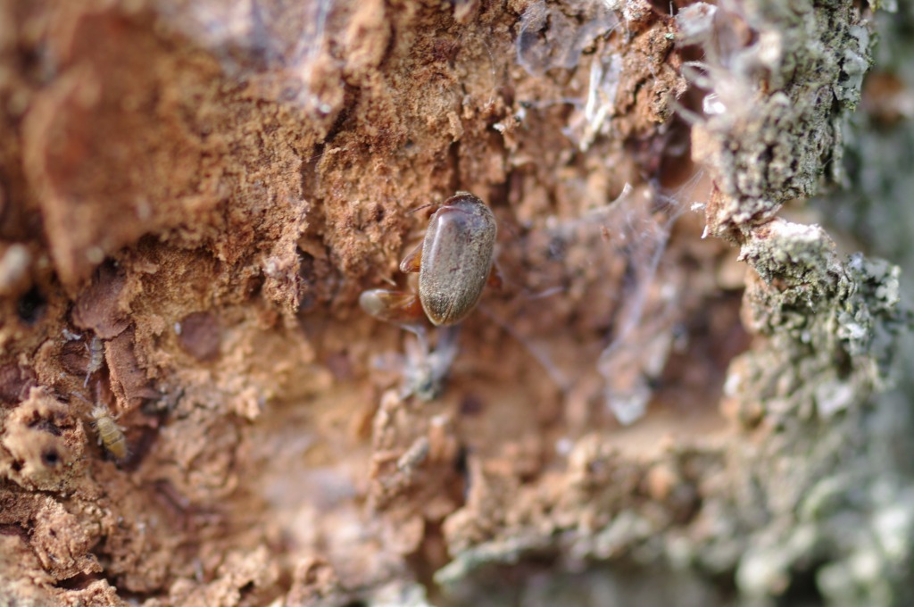 今は野鳥シーズンの冬ですが、腰を据えてじっくり見てみると、その他多くの生き物、とりわけ昆虫たちが活動する姿をみることができました。幹の背景色に同化したようなゴマダラチョウの毛虫、群れるヨコヅナサシガメ、葉の下のテントウムシなどなど。本日の記事を書いている公園スタッフ一押しは、ケヤキの樹皮内で越冬していた甲虫トビイロマルハナノミです。翅に細かな毛が見える、可愛い甲虫です。ポクポク