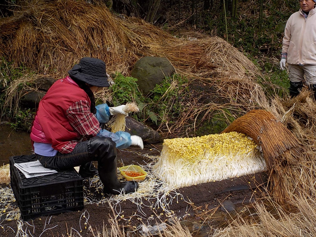 さて、当公園の出水地区では、伝統野菜である「ひご野菜」の水前寺もやしの収穫がありました。