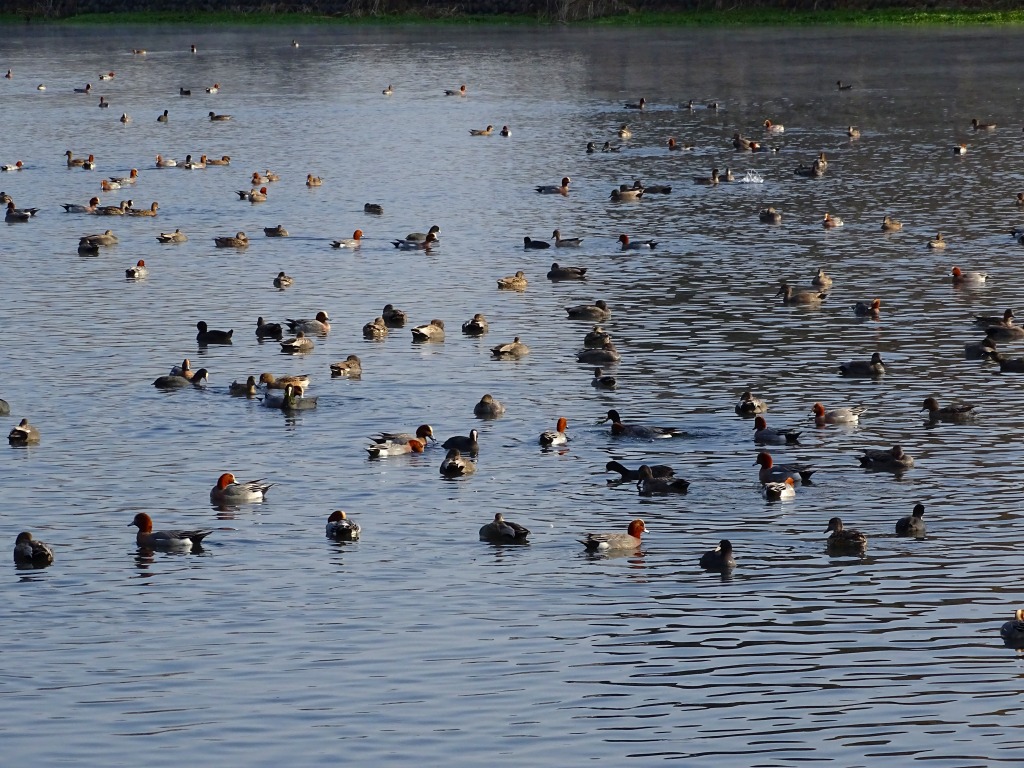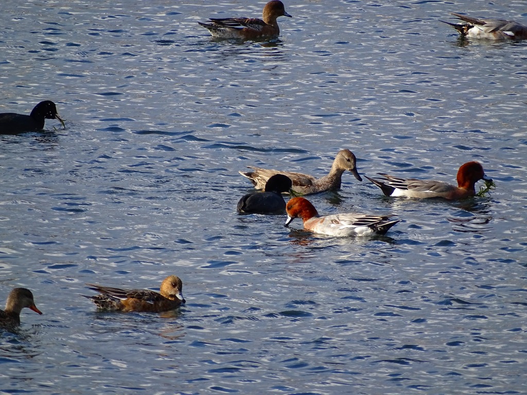 オオバンが逃げたり追いかけたり、ヒドリガモがエサを奪ったり、逆にオオバンがエサを奪ったりと、なかなか見ごたえのある場面を観察することができます。