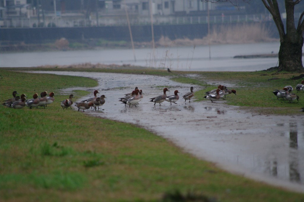 こんな人気の少ない日、公園では園路までヒドリガモがあがってくることがあります。
