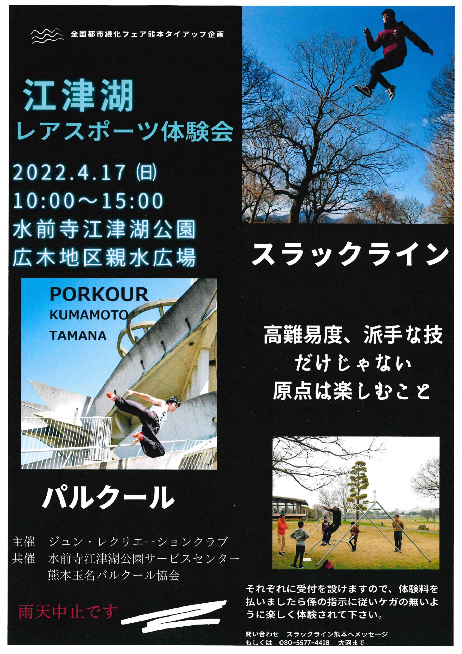 水前寺江津湖公園では、4/17(日)に、新しいスポーツ「スラックライン」と「パルクール」の体験会を実施します!