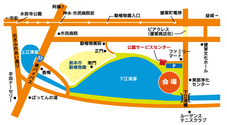 江津湖みなも祭り アクセスマップ - [公式]水前寺江津湖公園|熊本市の公園熊本の公園|熊本市水前寺江津湖公園(すいぜんじえづここうえん)
