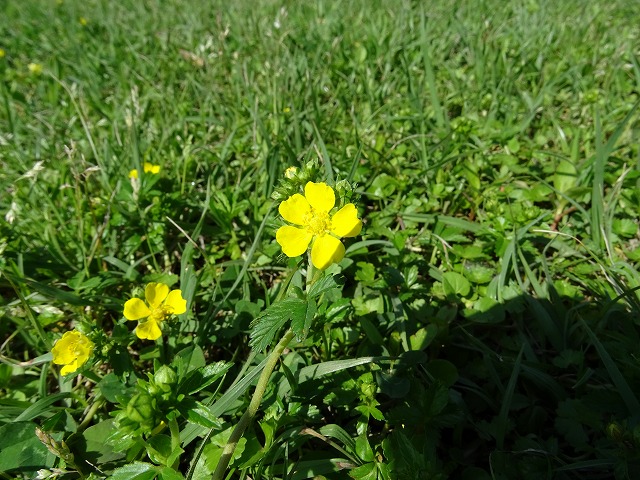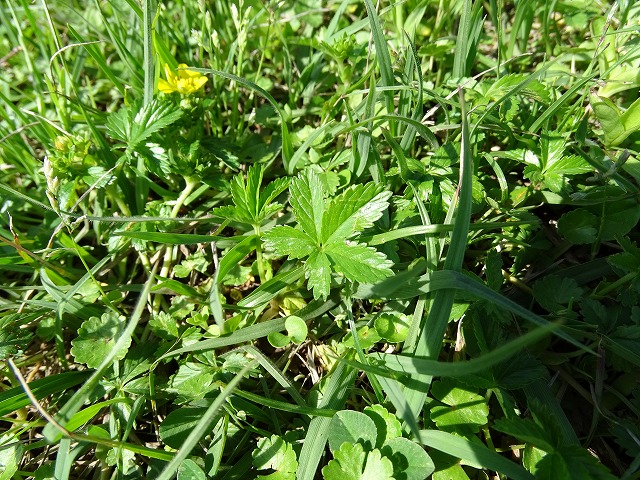 ヘビイチゴに似るが、葉が5枚の小葉からなることで見分ける。