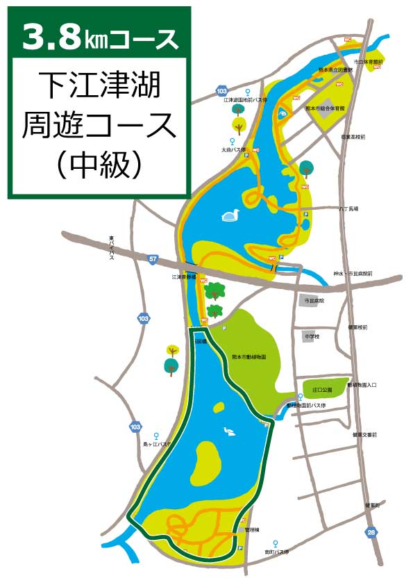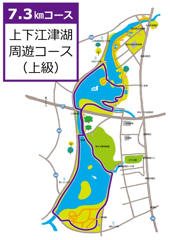 公認コースは、下江津湖を周回する3.8kmコースと、上江津湖・下江津湖を回る7.3kmコースの2コースが設定されています。どちらも、スタート/ゴールは広木地区のサービスセンター(管理棟)としていますが、コースは周遊となっていますので、お好きなところからスタートしてください。