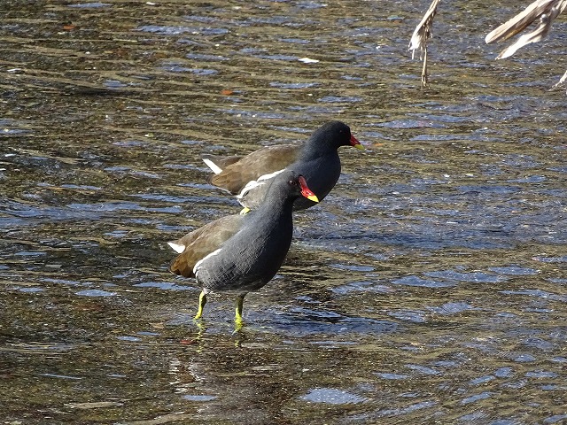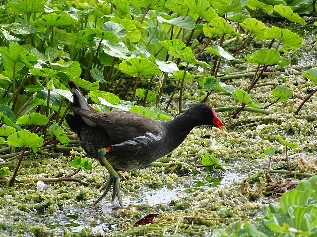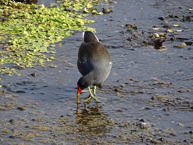 水辺でよく見かける、体の黒い水鳥。赤い額が特徴。